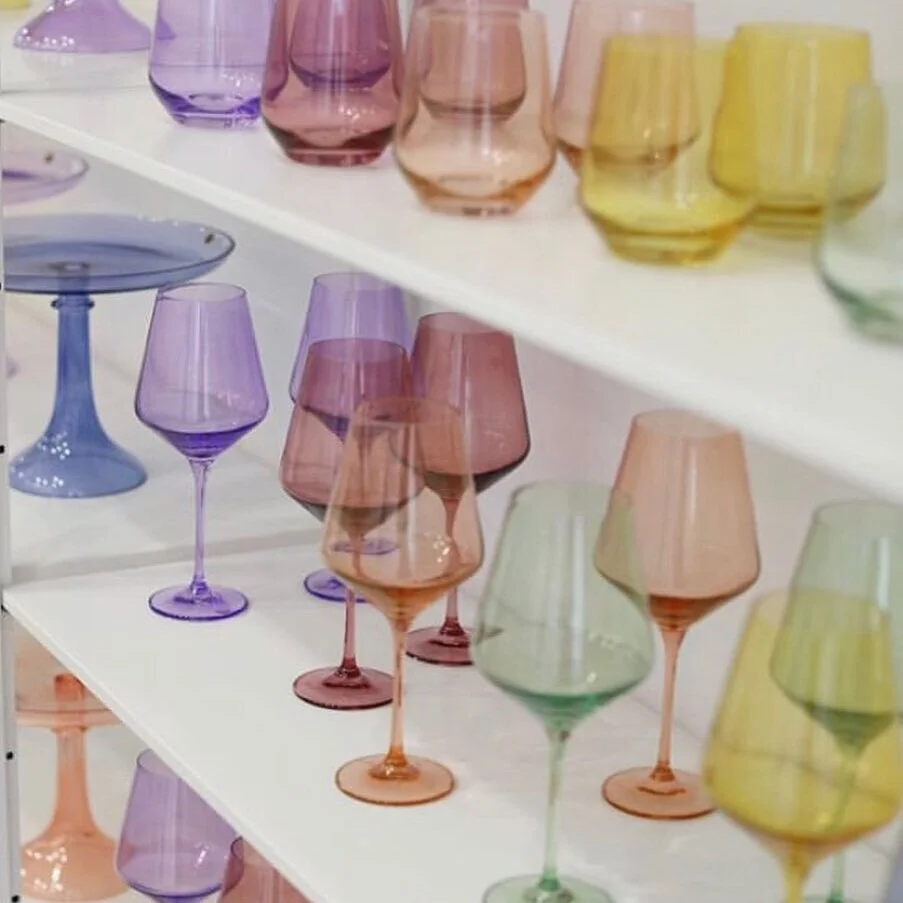 Hand-blown jewel toned and soft pastel vintage inspired glassware.